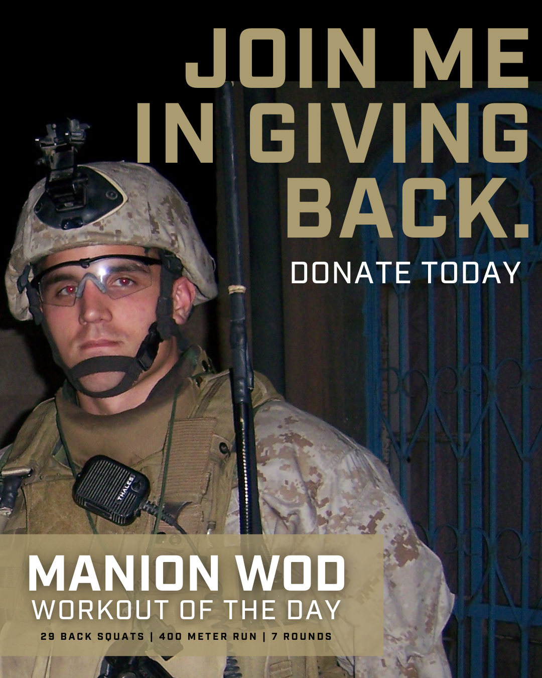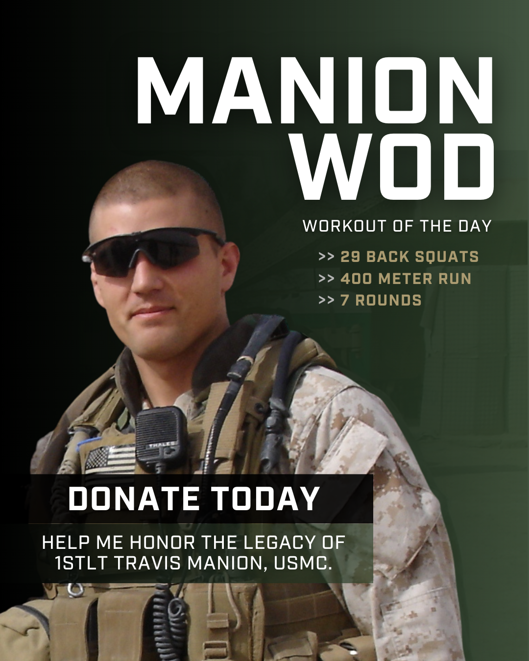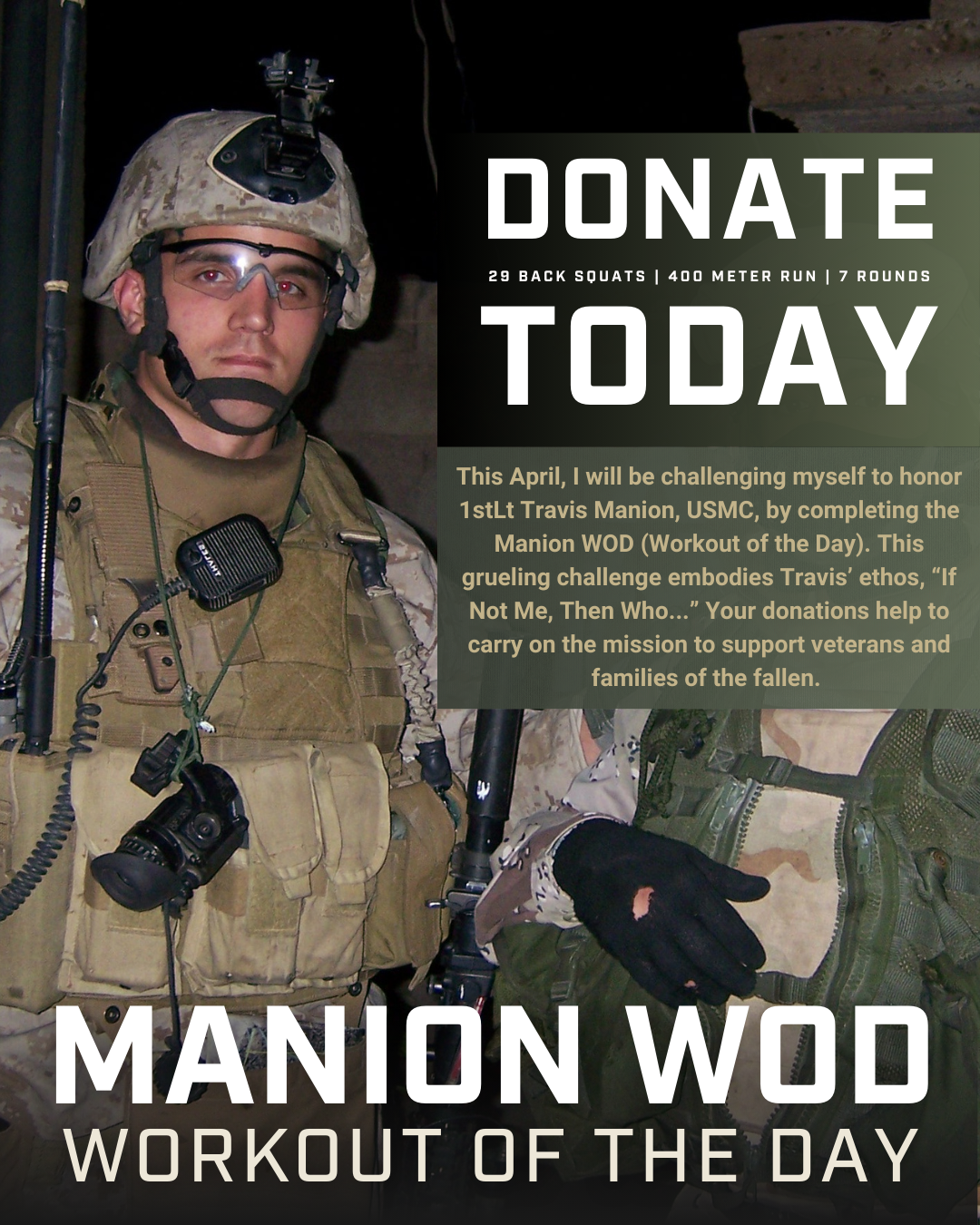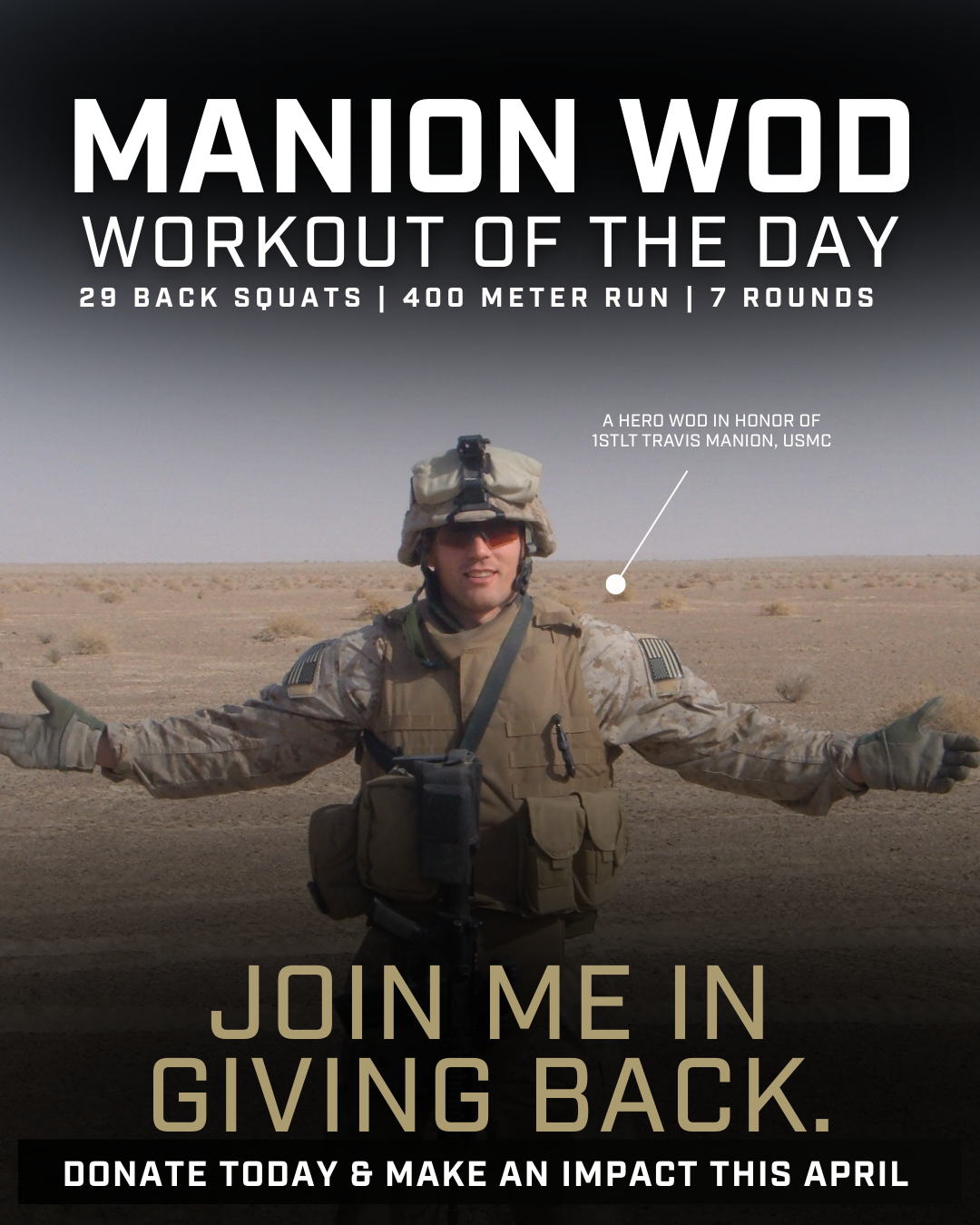 I am fundraising this April for @travismanionfoundation, as I take on the Manion WOD (Workout of the Day). This workout honors 1stLt Travis Manion, USMC, who made the ultimate sacrifice on April 29, 2007 — consisting of 7 rounds of a 400 meter run and 29 back squats, representing his final act of service.