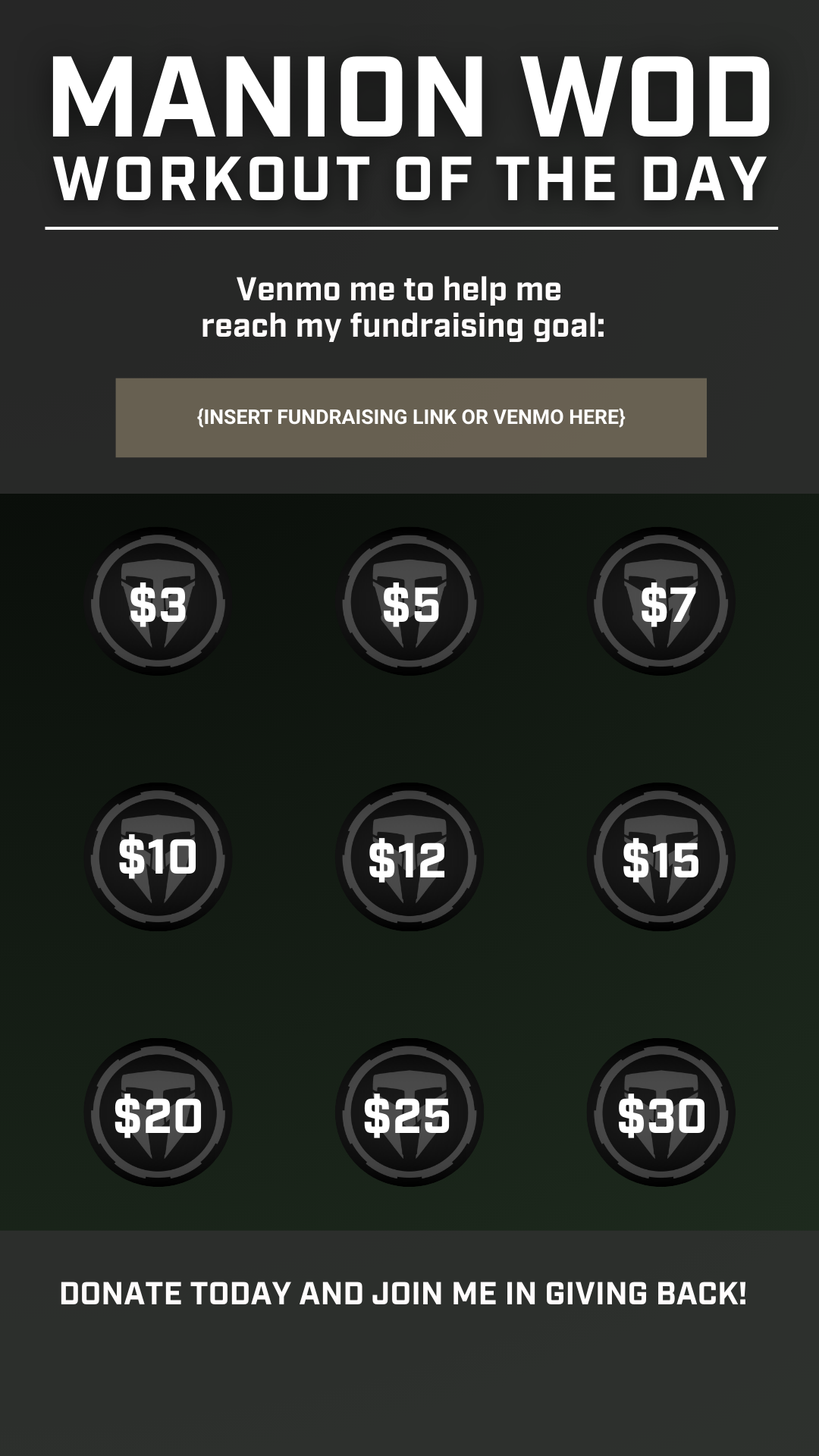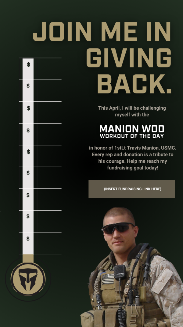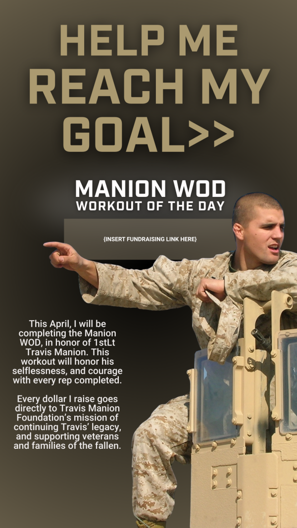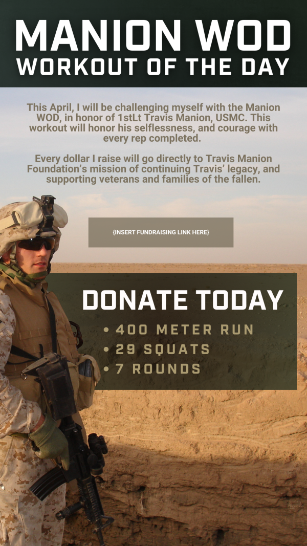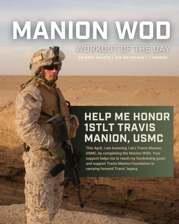 I am joining the Manion WOD (Workout of the Day) this April in honor of 1stLt Travis Manion, USMC. I am fundraising to continue his legacy and support meaningful programs for veterans and families of the fallen. Your donations help me make an impact! [INSERT FUNDRAISING LINK]