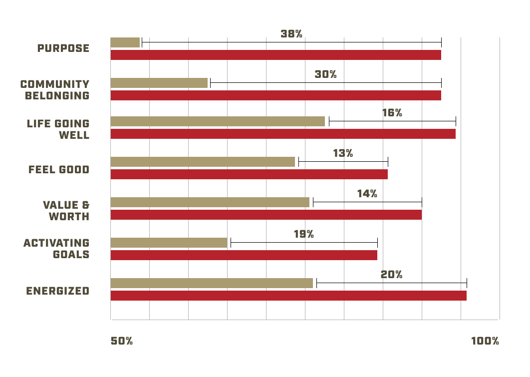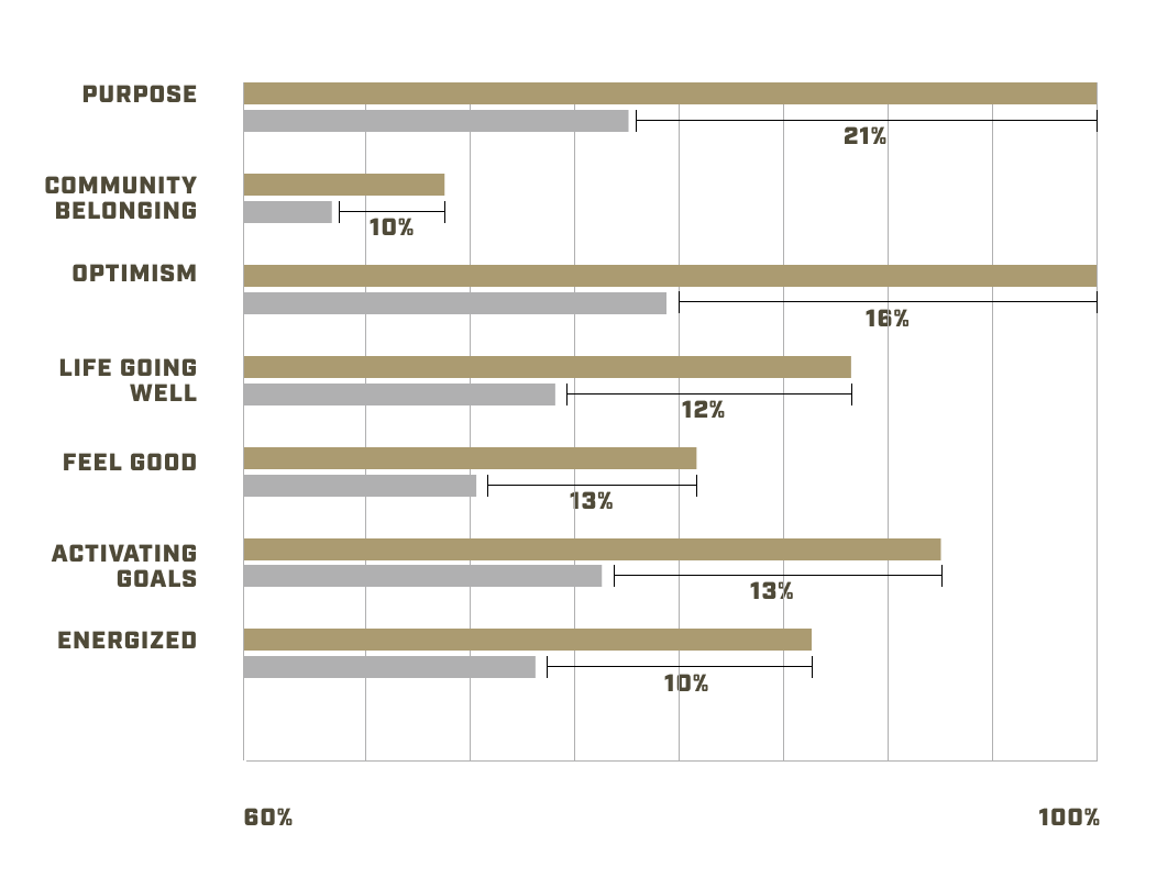 Disabled veterans in the program experienced some of the greatest increases across well-being measures, including a 27% increase in sense of purpose and feelings of worth.